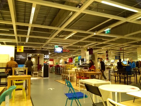 거기에 세워진 이케아 매장에서 많은 사람들이 쇼핑을 합니다.