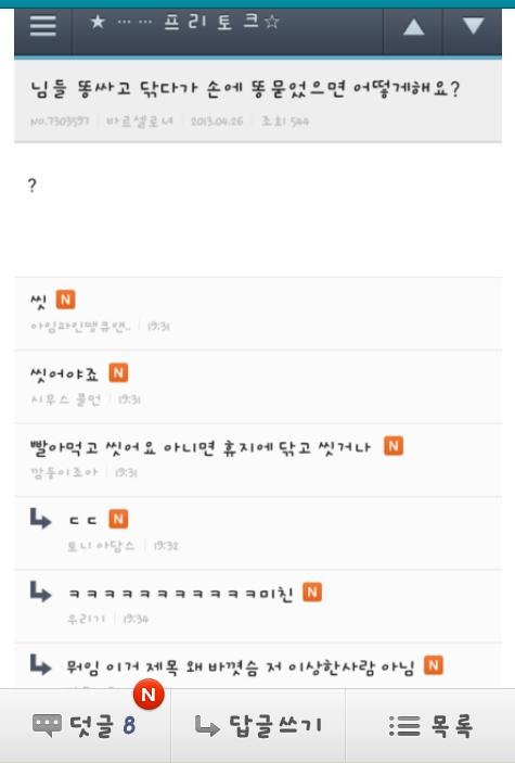 원래는 글제목이 양념치킨먹다묻으면인대 작성자가 똥으로 바꾸고 튐 ㅋㅋ