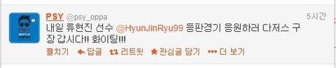류현진 선수 경기에 싸이가 진짜 간다고 +_+ 이렇게 트위터로 인증을 ㅋㅋㅋㅋ