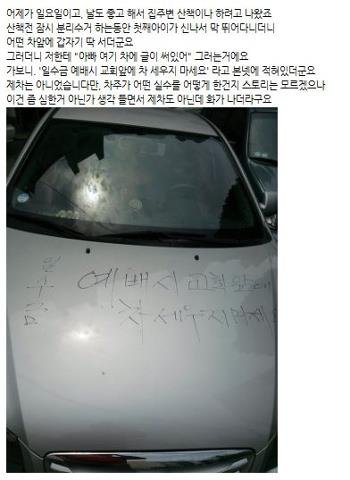 그러더니 저한테 "아빠 여기 차에 글이 써있어" 그러는거에요 가보니, "일수금 예배시 교회앞에 차 세우지 마세요'라고 본넷에 적혀있더군요 제차는 아니었습니다만, 차주가 어떤 실수를 어떻게 한건지 스토리는 모르겠으나 이건 좀 심한거 아닌가 생각 들면서 제차도 아닌데 화가나더라구요