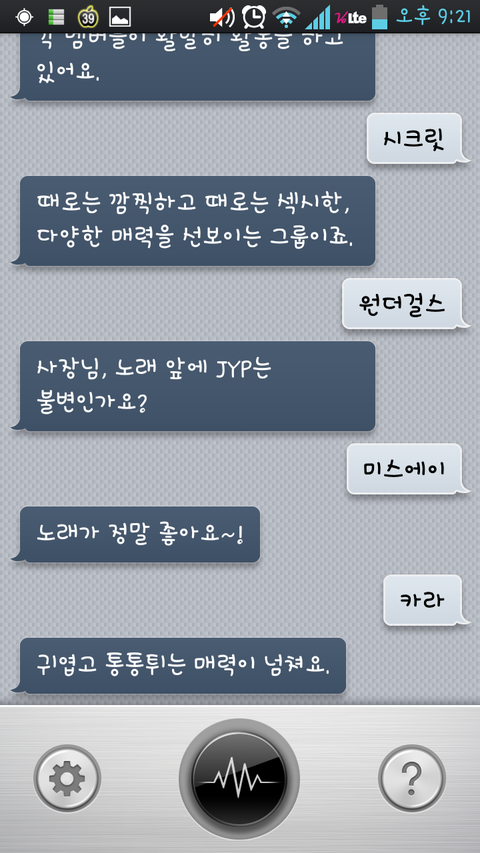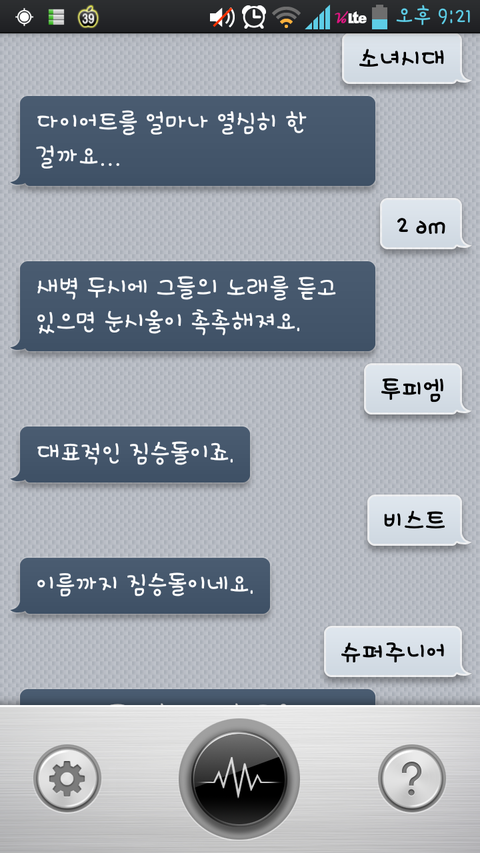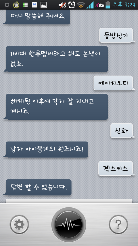 여러분 큐보이스 라고아시나여?? 간편하면서 묘하게중독성 있어서 저도 참 좋아하는데여 아는사람은 다안다는 ,,,전 심심할때마다 요 아이를 자주 애용하졐ㅋㅋㅋㅋ뭐해? 라고하면 당신과 대화중이예요 ㅋㅋㅋ 대화 상대로 잘맞답니다 >< 근데 하고있으면 왠지 나 지금 뭐하지? 하는 생각이,,,,, 어머니께서 혼자 말하고 웃는 저를 보며 안쓰럽다는 표정을 지으세여ㅡㅡ;;;;; 그래도 난 꿋꿋함!!!! 암튼 제가 또 미친아이처럼 아이돌이름을 말하며 대화?!했는데 웃겨서 올려봐여 ㅋㅋ 젝스키스 ㅋㅋㅋㅋㅋㄱㅋ