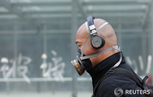 한 남성이 2일 중국 베이징에서 방독면을 쓴 채 거리를 걷고 있다. 베이징을 비롯한 북부 도시에선