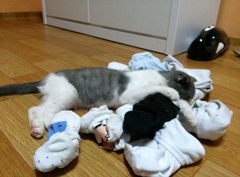 빨래를 개고있으면 그 위로 달려와서 눕는 춘봉이..ㅋ