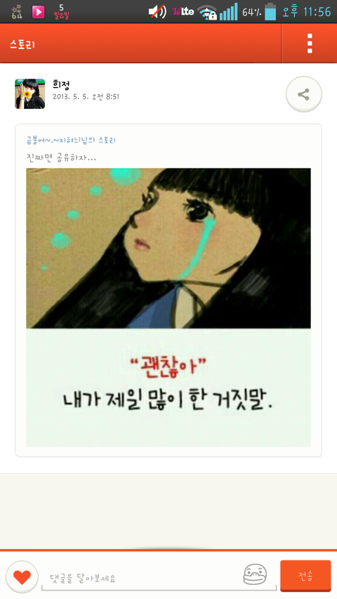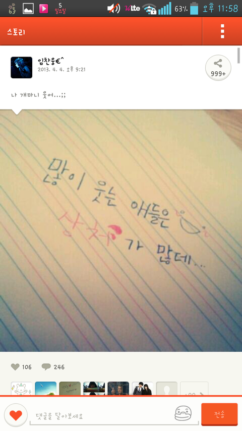 에휴 관심종자들 힘들고 아픈애들이 너희처럼 그런글 싸지를 생각이나 하겠나 카카오스토리 만든 사람들은 공유기능을없앴으면더좋겠음