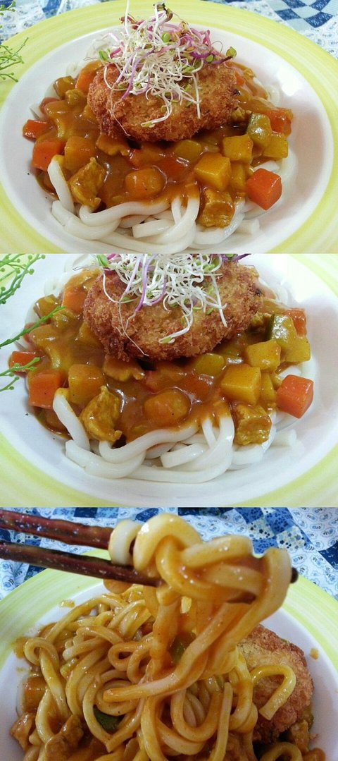 요것은 고로케를 얹은 고추장 카레 우동이에요~~ !