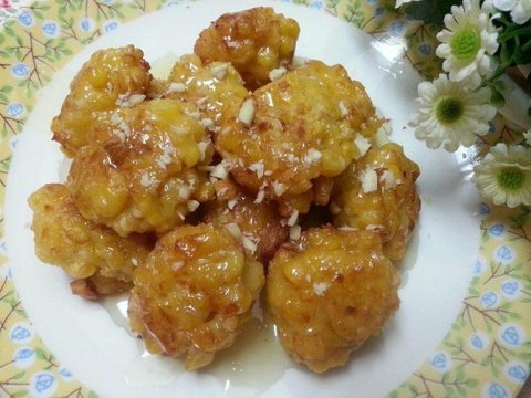 이건 옥수수맛탕~ 이에요 ㅋㅋ 옥수수통조림 이용해서 아몬드 잘게 부셔 넣어서 시럽 뿌렸어요