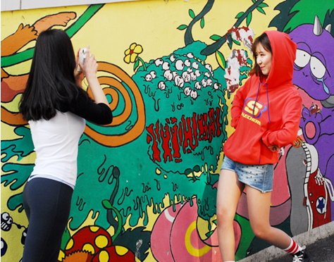 예술인들이 그려놓은 벽화 앞에서