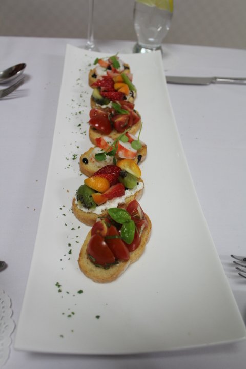 전날 만들어 놓은 리코타 치즈를 빵에 바르고 상콤한과일을 얹은 "과일 브르스케타