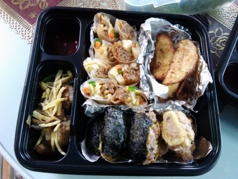 스팸 초밥, 무쌈말이, 꼬마김말이, 야채 버터볶음...