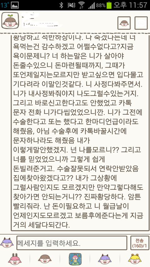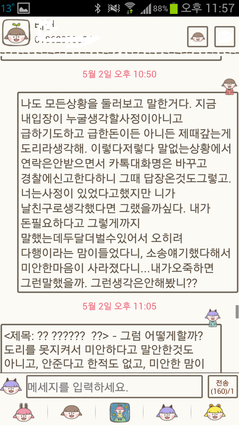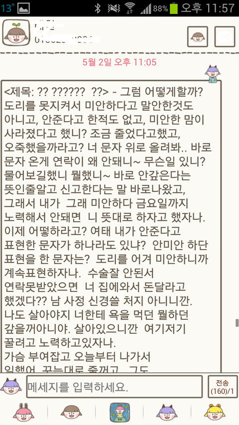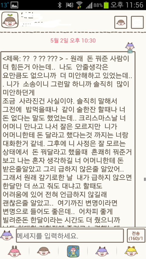 어제 돈이 안들어왔는데 부쳐줄수있냐고..지금 필요하다고.. 답장이 없더군요.;;(여기까지는 문자)