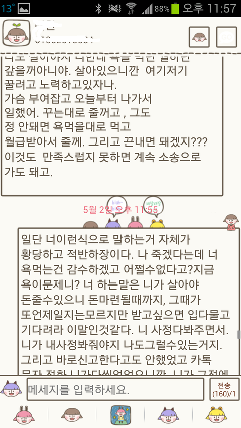 그래서 제가 '너 공황장애냐고 난 우울증 있는데 니가 돈 안부쳐줘서 상담비 결제못해서 지금까지 못가고있었다 수요일까지 돈 줘라' 하고 계좌번호 찍어보냈어요.