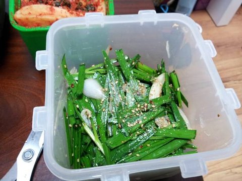 부추 겉절이에요 멸치 액젓을 조금넣고 무쳤어요.. 반찬통을 너무오바해서 담았어요