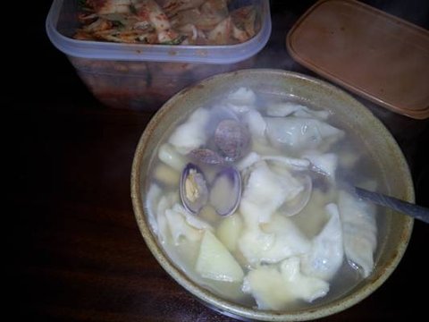 손수제비에요 반죽해서 뜯어 넣엇는데 파가 없어서 좀 없어보이긴 하지만 저래뵈도 맛있답니당(만두도 있어요 찾아봐요..)