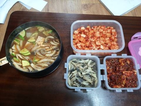 김치찌개와 반찬들이에요 밥그릇이 제일커요