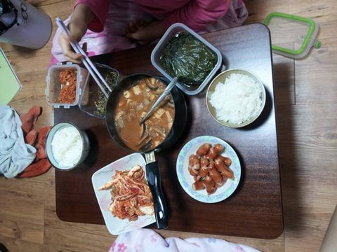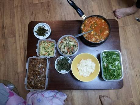 흔한 밥상이에요 저 밥상은 천장에붙은 모기잡으려고 올라갔다고 제깃털같은 몸무게를 이겨내지못하고 고인이되버린 불쌍한 밥상이에요.. (깨소금사랑해요)
