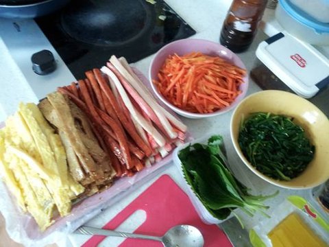 또 김밥을 쌌어요 시금치대신 부추를 넣었어요 저때진짜 김밥집 아주머니가 된기분이었어요 하루종일 김밥만 말았어요 언니가 싸는족족 먹었거든요..