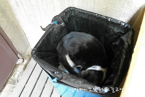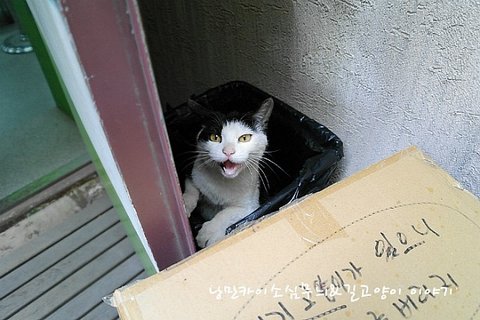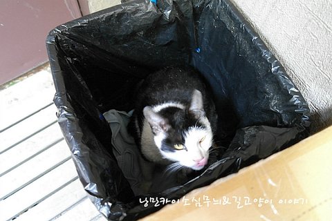 엄청나게 성질 자랑하며 부랴부랴 쓰레기통 속으로 들어가는 엄마 고양이 입니다.
