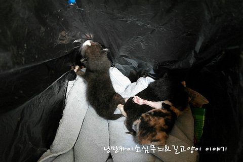 아기 고양이들은 엄마는 없어지고, 누군가 자기들을 들었다 났다 하니 겁을 집어 먹은듯