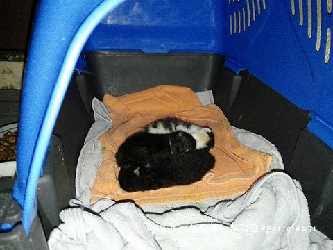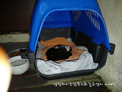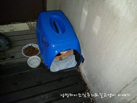 퇴근후 집에가서 이동장을 가져와 문은 떼어버리고 그 속에 수건을 깔아둔후