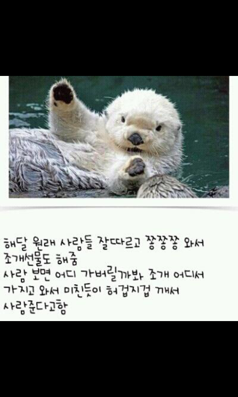 가족들이랑 만에 낚시하러갔었는데 잡은 물고기 넣어두는 어망을 해달이 끊고 가져감..어망을 품에 안고 옆으로 헤엄치면서 우리쪽 쳐다보는데 진짜...ㅋㅋㅋㅋㅋㅋㅋㅋㅋㅋㅋㅋㅋㅋㅋㅋㅋ그 해달이 보기에 그 어망은 씨푸드 뷔페였겠지