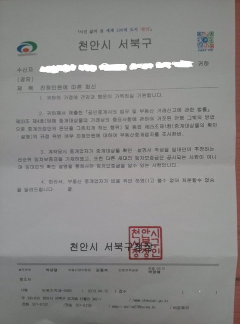 하지만 철저한 조사를 하다고 답변해 준다는 말과 달리 단지 제가 계약했던 중개업자의 진술만 가지고 부동산 중개업자가 법을 위반하였다고 볼 수 없어 처분할 수 없다라는 회신을 보내온 것입니다.