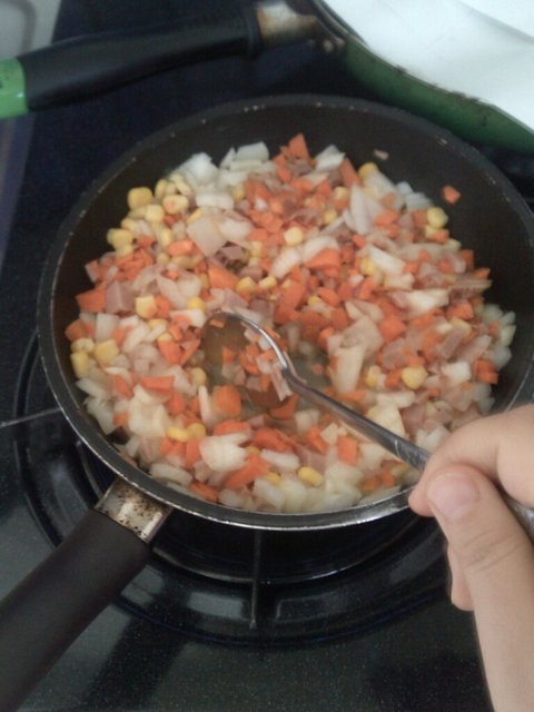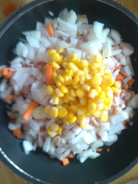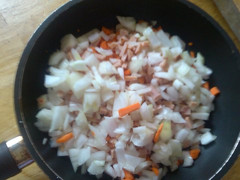 그럼 일단 당근,햄,양파를 잘게다져서 프라이팬에 투척함.