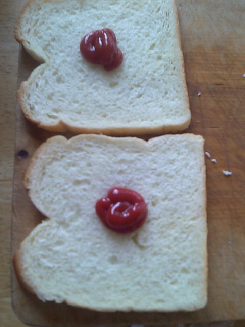 그럼이제 식빵을 2장을꺼내 식빵에다가 케찹을 뿌림