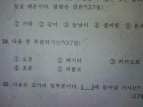 정답은 피콜로인데 피콜로가 드래곤볼에 나오는 케릭터 잖슴ㅋㅋ 그래서 베지터 카카로트 오공 다 집어 넣고 만화에 안나온 호른을 고르게끔 하려는 선생님의 어마어마한 심리전ㅋㅋ