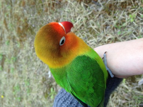 부리는 빨강/얼굴은 주황/날개는 녹색인 아까보당 모란앵무입니다