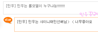데뷔초부터 태민선배 존경한다, 같이 춤춰보고싶다, 롤모델이 샤이니 선배님이라고....진짠가보다...ㅋㅋㅋㅋㅋㅋㅋㅋㅋㅋㅋㅋㅋㅋㅋㅋㅋ귀여워.....하하하.....민우도 춤진짜 잘추던데 잘하면 둘이 같이 춤추면 대박일듯....