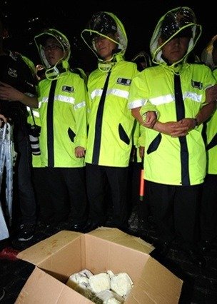 햄버거 박스를 전의경 머리 위에 올리는 등 경찰을 바보로 만듬