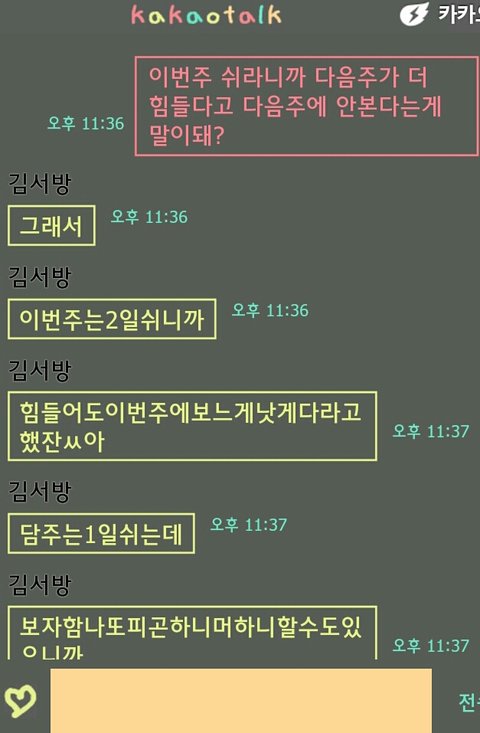 그게 쉬는거냐고 토요일날 놀고 일요일날 쉬어야 쉬는거지 라는 면박아닌 면박을 줘서
