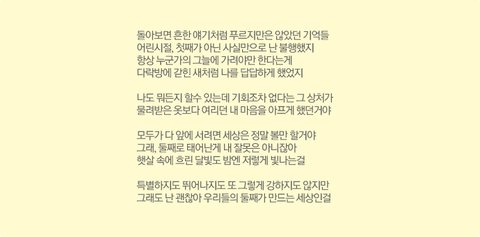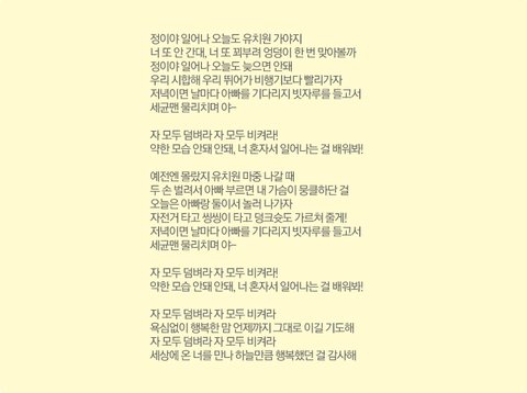 제가 가장 인상적인 가사는 ‘욕심 없이 행복한 맘 언제까지 그대로이길 기도해’ 입니다.