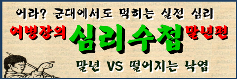 Q: 말년 되면 떨어지는 낙엽도 조심하라는데. 징크스가 되어버린 말. 병장들 사이에서는 우스갯소리로 “떨어지는 낙엽도 조심하라”라는 말을 듣기 전까지는 절대 말년이 아니라며 ‘누가 말년인가’ 대결을 펼치는 기준이 되기도 하지만. 이거, 웃어넘기다 작.살.납니다! 제가 떨어지는 낙엽에 맞아 거의 사망하신 말년님들을 한두 번 본 게 아니라서요. 마치 이건, 말년들을 깡그리 다 모아놓고 복숭아나무 앞에서 ‘에헤이 말년, 오기와 패기로 미친 듯이 막장으로 가보자’라며 의형제 결의라도 한 듯한 초자연적인 현상. 박수칠 때 떠나라는데. 그렇게 조용하던 사람도 말년만 되면 입과 몸이 근질근질하답니다. 하루는 말년병장 한 명이 떨어지는 낙엽을 보고 ‘엇 낙엽이다. 나는 떨어지는 낙엽도 조심해야하는 말년이라네. 말년파워~’ 라면서 뛰었다가 낙엽에 가려져 있던 배수로에 빠져서 전역하는 날 다리를 절며 집으로 돌아갔습니다. 몰래 가져온 휴대폰 때문에 영창도 가고 외박 나가서 군기문란으로 휴가제한도 걸리는 말년병장들. 그리고 더 무서운 건. 떨어지는 낙엽을 피한답시고 간부님들 눈을 피해 요리조리 숨어 지내며 투명인간으로 빙의하다가 걸려서 징계 받는 경우도 허다하다는 것. 이놈의 떨어지는 낙엽은 이제 유도 기능까지 겸비한 게 분명합니다! 오기부리다 하나 둘씩 꼬꾸라지는 말년들의 뇌구조, 궁금해죽겠어요!