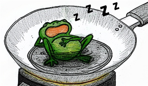 미국 코넬 대학에서 진행된 재밌지만 잔인한 “개구리 끓이기” 실험. 개구리를 뜨겁게 끓고 있는 물에 넣으면 바로 밖으로 뛰쳐나옵니다. 그래서 실험자들은 차가운 물에 개구리를 넣어놓고 서서히 물의 온도를 높여보기로 했습니다. 웬걸? 뭔가 이상하다. 물이 펄펄 끓어 목숨을 잃을 때 까지도 밖으로 나올 생각을 하지 않는 개구리. 천천히 바뀌는 온도를 인식하지 못하다가 냄비 안에서 꿈도 못 펼친 채 허망하게 죽게 된 것이죠. 개구리가 멍청해서 그렇지! 라고 말한다면. 천만에 말씀! 당신은 우물 안 개구리보다 못한 큰 착각 속에 빠져있는 겁니다.