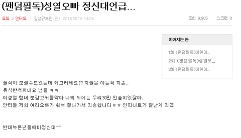 베톡에 올라가 있는 김성규부인의 글은 엔톡에서 활동중인 젤좋(예전닉넴)의 사칭 어그로 글로