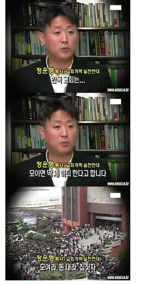 솔직히 교회다니는 사람으로써도 요즘 한국교회 많이 썩은거 압니다. 그런데요 글쓴이님 마지막짤은 성경을 잘못 해석하신것 같네요. 그것만이라도 지워주시길 간곡히 부탁드립니다. 그리고 저희들도 이단들이 크리스천이라며 개독질하는것 하나님의 이름으로 물질을 챙기는 것들을 보면 화가나는것은 마찬가지 입니다. 예수께서 성전에 들어가사 성전안에서 매매하는 모든 사람들을 내쫓으시며 돈 바꾸는 사람들의 상과 비둘기파는 사람들의 의자를 둘러 엎으시고 그들에게 이르시되 기록된바 내 집은 기도하는 집이라 일컬음을 받으리라 하였거늘 너희는 강도의 소굴을 만드는도다 하시니라 (마태복음 21장 12~13절)