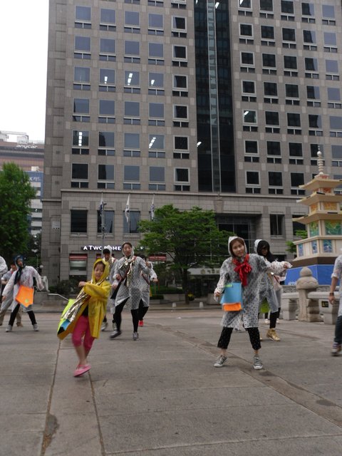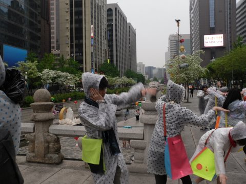 사람들이 단체로 비오는날 우비쓰고 춤추던데....