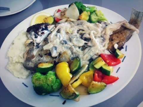 가자미 화이트소스 구이와 매쉬드포테이토, 야채볶음