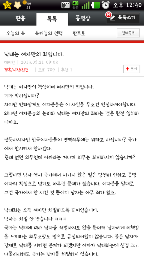 아직도 군대와 임신을 비교하고 있네. 쯧쯧.. 너희도 임신해라 군대갈게 ^^ 한달에 일주일씩 생리하고~ 그럼 군대 2년? 그쯤이야ㅋㅋㅋ 가주지. 뭐.ㅋㅋㅋㅋㅋㅋ 어떻게 생명 생사를 죽이고 살리는 일이 여자들의 잘못인가. 생명의 결실은 여자 남자 같이 만드는건데 여자만의 잘못이다? 완전 어그로꾼이네 제발 군대와 임신을 비교하지 말아라.ㅡㅡ 개념없다는 증거니까 ╋추가 내개인적인 생각을 적었을뿐인데 베플됫네ㅋ 내가 언제 군대랑 임신을 비교햇냐? 글요지를 이해못하면 그냥닥처라 이런새끼들은 남녀평등 외치면안돼ㅉㅉ 반대수보소 남자새2끼들 열폭쩌네