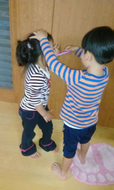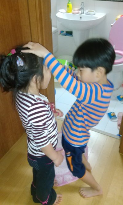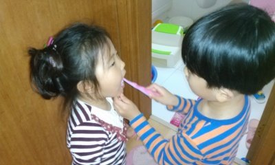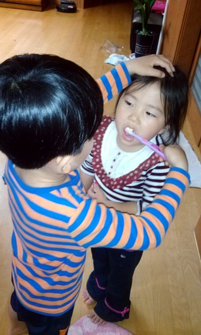 동생이 오빠한테 이 닦아달라고 해서 오빠가 닦아 주는 중이랍니다 ^^