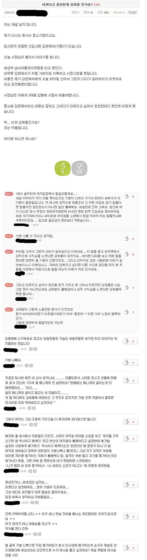 이건 남자분도 억울하겠네요. 댓글들이 더웃기네요. 그런 생각들 때문에 성형 괴물이란 소리가 나오는것 같아요. 여성분들은 하이힐을 신는 이유가 뭔가요? 자기 다리를 길어보이게 강조하는거자나요. 그럼 다리가 당연히 먼저 보이는거지 그리고 뭘보지마요. 눈이 있는데 어떻게 안봐요. 그럼 하이힐은 신지말고 치마를 입지마요. 얼굴이 못생겨서..? 얼마나 잘나고 조각 같이 생겼으면 그런 소리가 나올까요? 그걸 신고한 여성분은 그렇다 쳐도 댓글을 단 사람들이 더 이상하네요. 자기 몸 다드러내게 입으면서 보지는 말라? 그럼 왜입죠? 그리고 회사에 샌달이라니... 맨발이라니.... 그건 어느나라 개념인가요...... 남잔 뭐만하면 성희롱이네요. 여성분들도 그런거에 기분나쁘면 왜 그렇게 입는거에요. 자신감인데 그걸 칭찬하는데 뭐가 성희롱이야. 이제 무서워서 칭찬도 못하는 세상이겠네요.