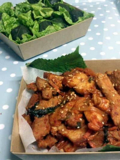 이건 쌈밥하고 고추장불고기예요. 쌈밥은 밥 동그랗게 빚어서 살짝 데친 깻잎에 한번 싼 다음