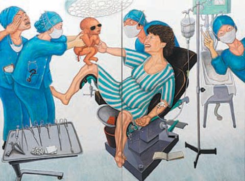 위 사진은 유명한 진보 인사 홍성담 화백이 그린 그림으로, 박근혜 대통령(당시 후보) 가 박정희 전 대통령의 심볼이라고 할수 있는 선글라스를 낀 아이를 출산하는 모습을 그린 그림이다. 즉, 박근혜가 박정희를 출산한다는 의미로, 당시가 대선기간임을 감안할때, 박근혜가 대통령이 되면 다시 박정희 시절같은 유신으로 되돌아간다는 풍자를 한 것이라고 추측된다.