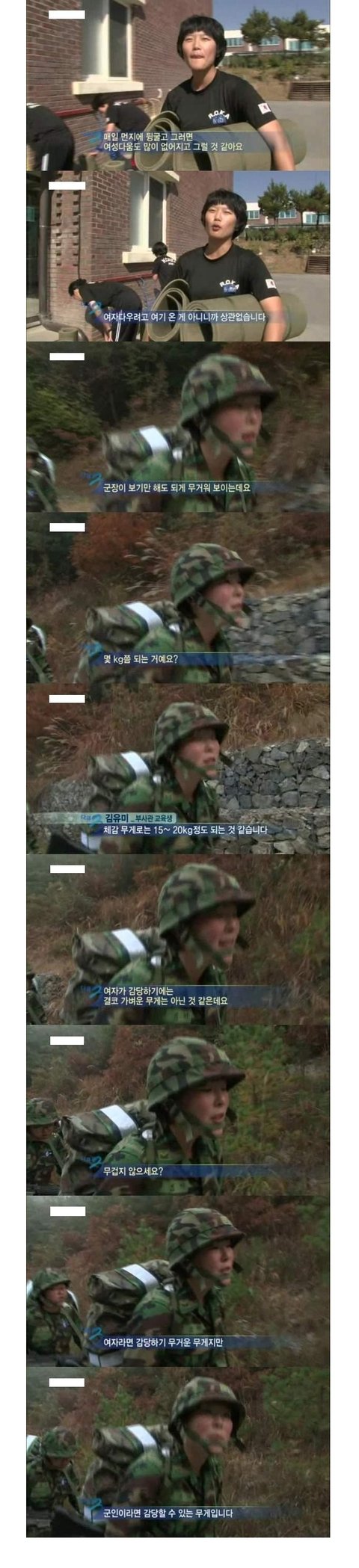 나여잔데 요즘북한어쩌구하면서여자도 한6개월정도는 군대가야된다는생각하고잇는데...ㄷㄷ저분보니까 여자들군대가면그냥 방해만되고 걸리적거릴꺼같다.... 나만 해도 조카 징징될텐데....
