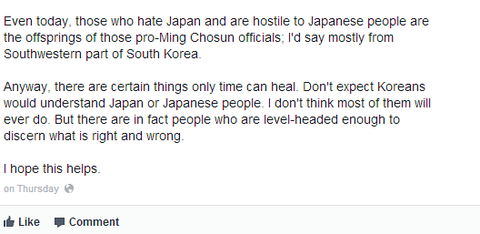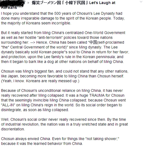 P 씨의 글은 대~~강 이런내용임:"한국은 조선시대부터 노예근성이 철저했다ㅋ왜냐고? 명나라 노예처럼 지냇거든ㅋ조선은 중국의 중화사상에 비위 살살 맞춰가면서 발발 기엇다ㅇㅇ너무 명나라를 떠받들고 우상시해서 심지어 중국인들이 샤워 안하는것까지 따라햇음ㅇㅇ그리고 한국인들은 백날 말해봐야 일본인 말 안들을것이니 포기하셈..한국인이 다들 바보는 아니지만 아마 설득하는데 실패할것임...그리고 요즘 일본 시러하는 사람들은 그때 그 명나라를 지지햇던 조선 정부의 후손들임"