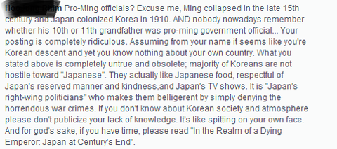 나:"무슨 명나라임 명나라는;;; 명나라는 15세기에 망햇고 대한민국은 1910 년에 식민지화 됫는데 개1소리하지마셈 님 이름보니까 한국인 같은데 제발 뭐 좀 알고 말하셈 요새 개념잇는 한국인들 일본인은 안싫어함 말도 안되는 개소리 하는 일본 정부를 싫어하는 거임 일본음식 좋아하고 일본 문화예절 좋게 보고 일드 많이 봄 그저 과거 전쟁 범죄를 계속 부인하는 우익을 싫어할 뿐임 제대로 모르면 입 다물고 잇으셈 그리고 시간나면 죽어가는 천황의 나라에서 라는 책 좀 읽는것도 좋겟음 제발"