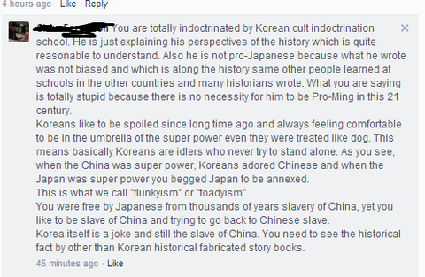 "니는 졸라 한국의 역사교육에 희생자다. 저 한국인(맨위에 P씨)는 매우 논리적으로 역사를 알기 쉽게 설명한 것일 뿐이며 일본을 옹호하는 게 아니다. 왜냐하면 그의 역사관은 편견이 없기 때문이다. 대다수의 역사학자들이 그를 동의하며저게진짜역사지 니네가 배우는 역사는 ㅄ이다 그(P씨) 는 명나라를 지지할 이유가 없지 않겟나? (여기서 이새끼가 뭔 개소리를 하는지 모르겟음;;;걍 뇌가 없는듯) 한국인들은 예전부터 지배당하는걸 좋아하엿고 노예 근성이 철저햇으며 개처럼 취급받기를 좋아했다. 한국인들은 게으르기 때문이다. 알다시피 명나라가 강려크햇을땐 중국에 빈대하고 일본이 강대국이 되엇을 땐 제발 한일합방 해달라고 빌엇던 병맛 나라이다. 그것은 Flukyism 또는 toadyism 이라고 불린다(<--노예근성을 지칭하는 말입니다ㅡㅡ)