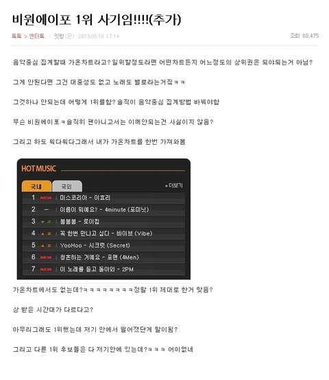 저차트들에서 1위를 못한다고 조작이라는 말이 떠돌고,이 글을 쓰신분은