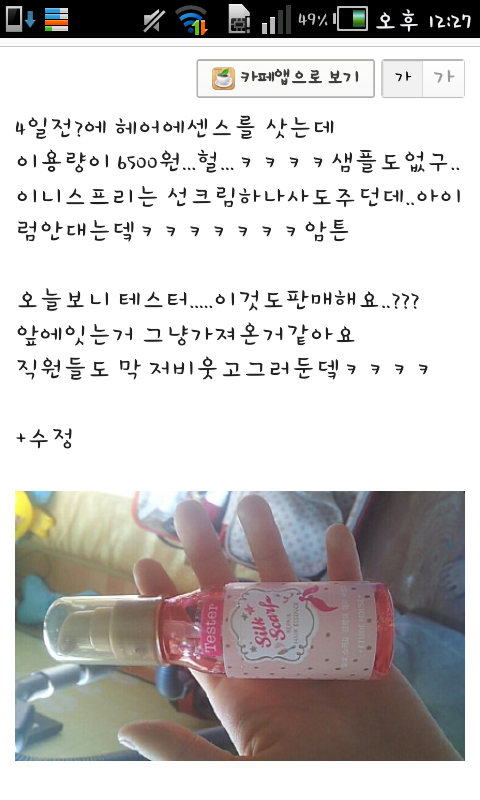 요약)6500원짜리 헤어에센스를 샀는데 테스터였고 직원은 그걸 알고서도 팜.